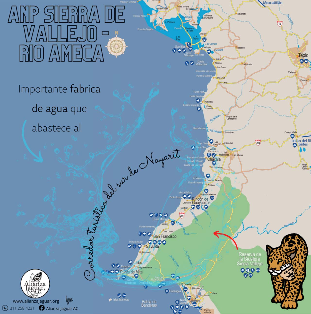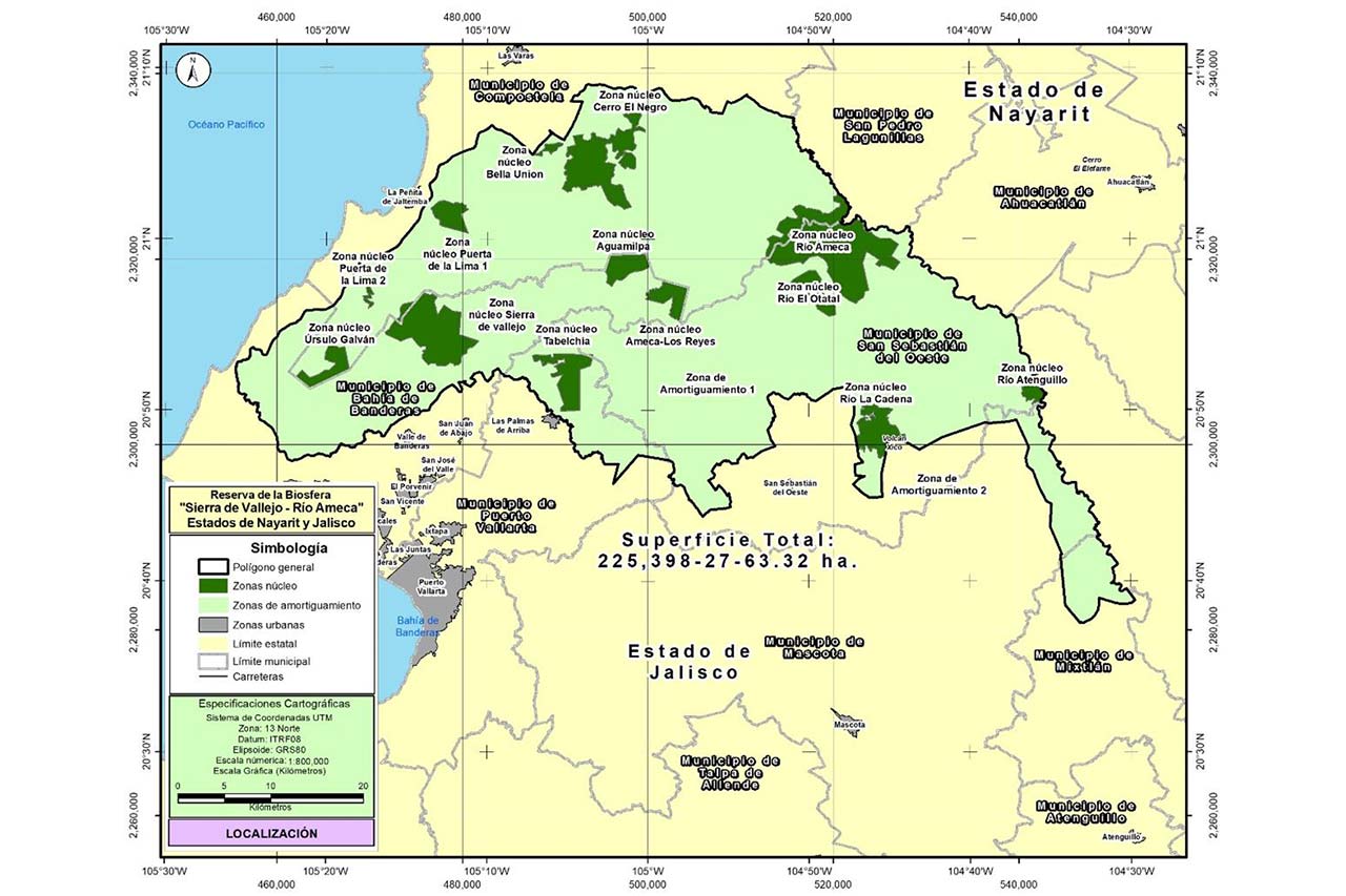La propuesta de creación de la Reserva de la Biosfera Sierra de Vallejo-Río Ameca (RB Sierra de Vallejo-Río Ameca) se encuentra en los municipios de Bahía de Banderas y Compostela, en el estado de Nayarit y en los municipios de Mascota, Mixtlán, San Sebastián del Oeste y Puerto Vallarta en el estado de Jalisco, con una superficie de 225,398-27-63.32 hectáreas. Esta propuesta impulsará la protección y conservación de los hábitats cuyo equilibrio y preservación son fundamentales para la existencia de 1, 261 especies de las cuales corresponden a seis líquenes, 156 hongos, 531 plantas vasculares, 127 invertebrados y 439 vertebrados, que representan el 10 % de las especies registradas para el estado de Jalisco y el 20 % respecto al estado de Nayarit; 278 son especies endémicas, 35 especies se consideran prioritarias, asimismo, 85 especies se encuentran bajo alguna categoría de riesgo conforme a la “Norma Oficial Mexicana NOM-059-SEMARNAT-2010, Protección ambientalEspecies nativas de México de flora y fauna silvestres-Categorías de riesgo y especificaciones para su inclusión, exclusión o cambio-Lista de especies en riesgo”, publicada en el Diario Oficial de la Federación el 30 de diciembre de 2010 y en la “Modificación del Anexo Normativo III, Lista de especies en riesgo de la Norma Oficial Mexicana NOM-059-SEMARNAT-2010, Protección ambiental-Especies nativas de México de flora y fauna silvestres-Categorías de riesgo y especificaciones para su inclusión, exclusión o cambio-Lista de especies en riesgo, publicada el 30 de diciembre de 2010”, publicada en el Diario Oficial de la Federación el 14 de noviembre de 2019 (NOM-059-SEMARNAT-2010), como es el caso de la rana chirriadora pálida (Eleutherodactylus pallidus) y el mamey (Saurauia serrata), especies endémicas sujetas a protección especial; el murciélago magueyero mayor (Leptonycteris nivalis) y la nutria de rio (Lontra longicaudis) catalogadas como Amenazadas y algunas especies en peligro de extinción como la guacamaya verde (Ara militaris), el loro corona lila (Amazona finschi) y el jaguar (Panthera onca), que destaca por su importancia biológica y cultural.